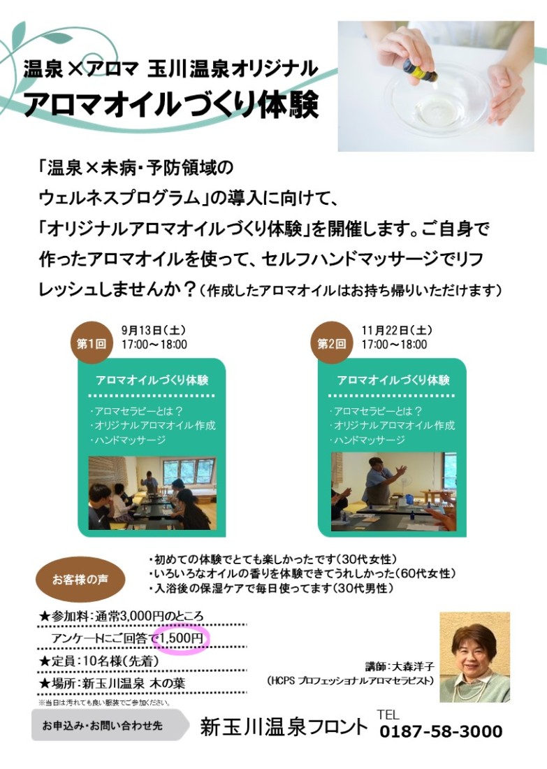 「玉川温泉オリジナルアロマオイルづくり体験」を開催します。