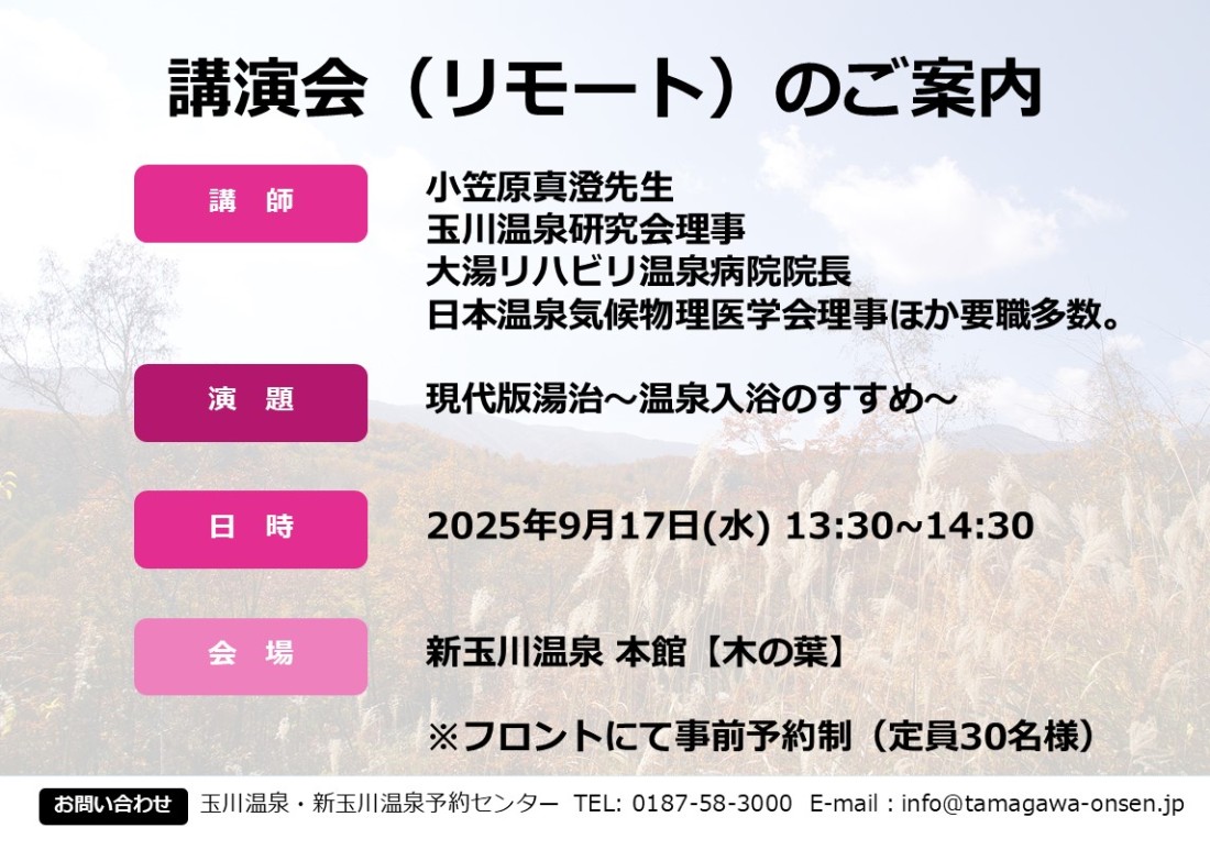 来る9/17(水)13:30より、一般社団法人玉川温泉研究会理事をお務めいただいております、小笠原真澄先生による講演会を開催いたします。当日は、Zoomを利用したリモート形式での開催を予定しております。講 師:小笠原 真澄 先生(一般社団法人玉川温泉研究会理事)演 題:現代版湯治~温泉入浴のすすめ~日 時:9月17日(水)13:30~14:30 ※フロントにて事前予約制(定員30名様)会 場:新玉川温泉 本館【木の葉】皆様のご参加、お待ちいたしております。