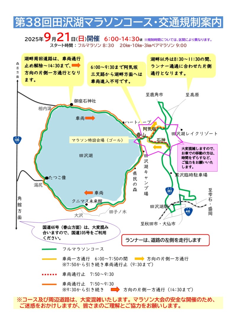 9月21日 第38回田沢湖マラソン・交通規制について